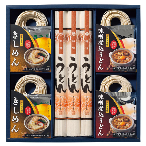 「きしめん」と、特製の味噌を使って煮込む「味噌煮込うどん」を詰合わせた名古屋名物の贈りものです。