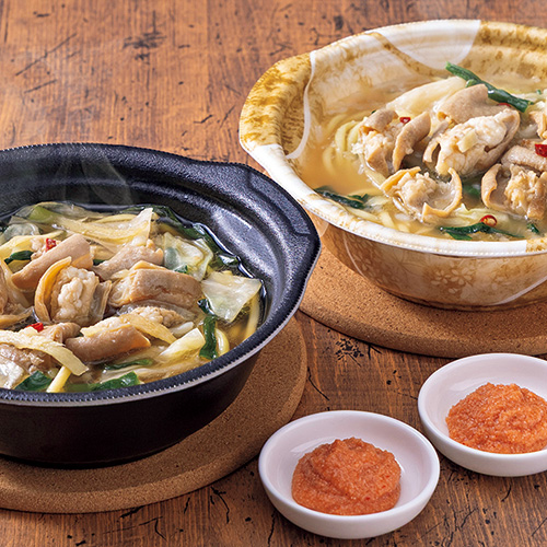 電子レンジで簡単に調理ができる個食もつ鍋。もつ肉、野菜、ちゃんぽん麺が入って、味もボリュームも大満足! あごだし醤油と味噌味の2種類をご用意しました。