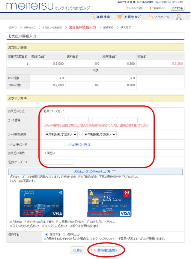 カード番号 ・カード有効期限・セキュリティコード・名鉄ミューズIDを入力し、「最終確認画面へ」ボタンをクリックしてください。